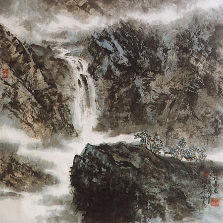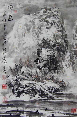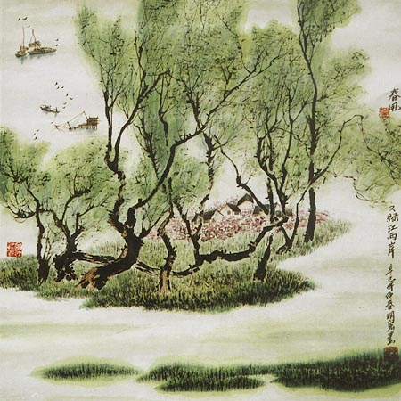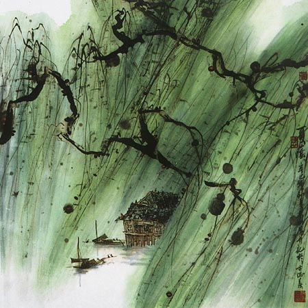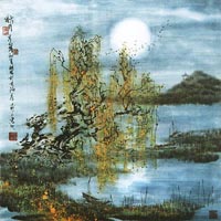 系列作品以点线面为主,笔中有墨、墨中有笔,以线的干湿、出入变化体现线的造型、线的弹性及其凝练的有虚实节奏的美感魅力,更显得章法得体,笔墨味道自然微妙,而整体结构,墨色对比恰到好处。作品不管从何起笔,则是先得气势再精雕细琢,不断深化层次取得意境。从《夏阴》作品看风中柳絮的线条,是那么的轻柔,像是用心灵之眼抚摸出来的一样,笔笔含情、笔笔飘逸、笔笔见空灵、笔笔见质感。他的《秋月》作品中云水增加了画面的虚实对比,画中天地适当,画面厚重而深远,干湿、浓淡、疏密的构成中,展示出一种特有的艺术灵性和韵味。在这种观照中,流动出春的醋畅、夏的爽朗、秋的持重、冬的空灵,流动出生命形式的情感节奏,流动出画家的笔墨修养和高超的艺术境界。