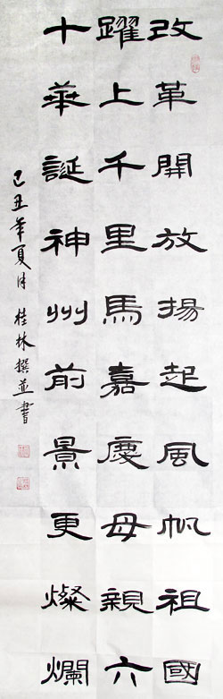 1947年出生于江苏宜兴,酷爱书法,以秦篆汉隶入门,尤精隶艺,作品在全国、省赛事中多次获奖。现为无锡市老年书画协会会员,宜兴市老年书画协会理事。