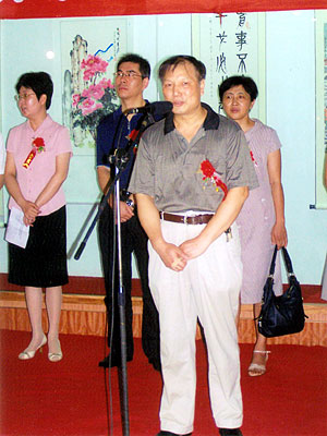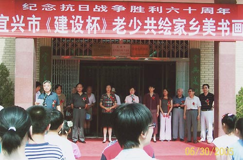 2005年6月30日,老干部书画协会与市关工委、市教育局联合举办《纪念抗战胜利60周年 宜兴市“建设杯”老少共绘家乡美书画展》在市美术馆隆重开幕,开幕式由市关工委主任赵利双(前左1)主持,市人大副主任杨亚君(后左4)、市政府副市长洪雅(后左5)、市政协副主席钱忠道(后左3)、以及市教育局、市美协、书协等有关部门的领导参加开幕式。 |