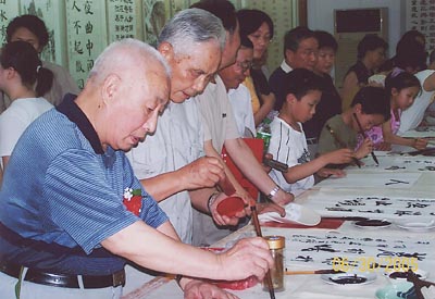 开幕式后,老干部书画协会和青少年获奖作者的代表在市美术馆举行了联合笔会。图为老干部书画协会会长李海山(左1)、会员史济康(左2)正与中小学生代表一起创作。 |
