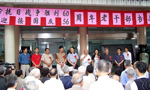 2005年9月26日,老干部书画协会举办《纪念抗战胜利60周年暨迎接国庆56周年老干部书画展》在市老干部活动中心开幕,原市委副书记徐达增(左5),以及市老干部局、民政局、市文联、书协、美协、荆溪诗社的领导参加了开幕式。 |