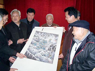 市档案局局长潘永明、老干部局局长吴祖良和老干部书画协会会长李海山等在观看收藏入馆的葛天声(左2)作品《风雪大别山》。 |