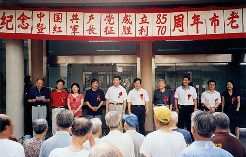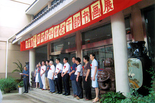 2006年6月23日,市老干部书画协会隆重举办纪念建党85周年暨红军长征胜利70周年书画作品展,市委副书记邵亚群(左6)、市老干部局局长吴祖良(左5)、市文化局、民政局、文联、书协、美协、以及老干部活动中心的领导参加了开幕式。 |