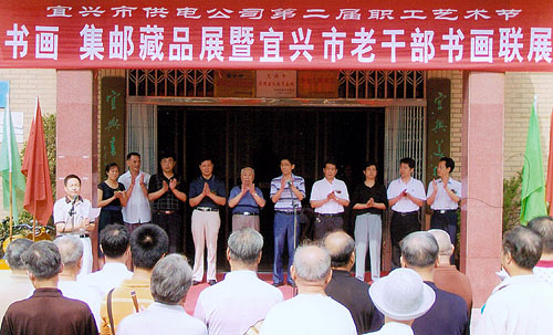 2006年9月3日,市老干部书画协会与市供电总公司“第二届职工艺术节书画集邮藏品展”在市美术馆隆重举行,市供电总公司党委书记、总经理凌峰(右5)及全体领导班子成员,市老干部局局长吴祖良(左5)等领导参加了开幕式。 |