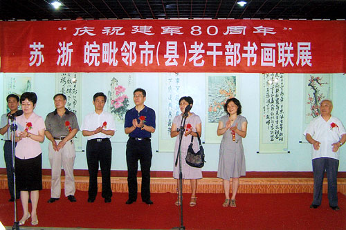 2007年7月25日,由市老干部局组织的苏浙皖江阴、长兴、广德、宜兴四市县老干部书画联展在宜兴徐悲鸿纪念馆和宜兴美术馆隆重举行。副市长洪雅主持开幕式。后排左起为:长兴县老干部局局长,宜兴市书协主席储云,宜兴市老干部局局长吴和君,宜兴市委常委、组织部长李江,广德县老干部局局长,江阴市老干部局局长,宜兴市老干部书画协会会长李海山。 |
