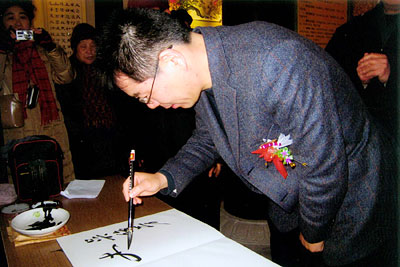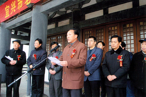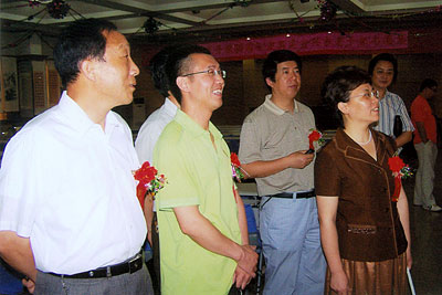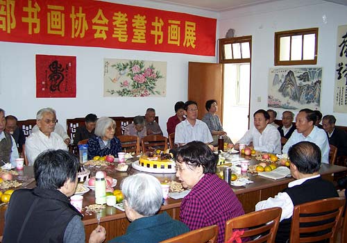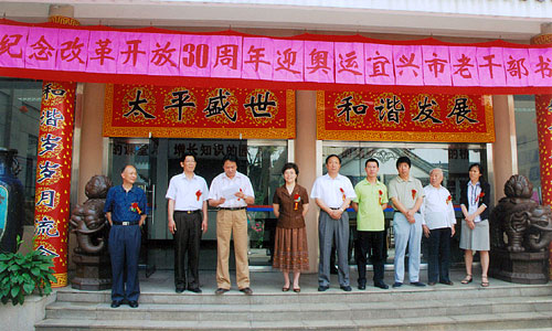 2008年5月29日,宜兴市老干部书画协会隆重举办纪念改革开放30周年、迎奥运、宜兴撤县建市20周年书画展。共展出作品118幅。市委常委、宣传部长许伟英(左4),市文联主席徐风(左3),市老干部局副局长蒋宝军(左2),市老干部书画协会会长高正昌(左5),市老干部书画协会名誉会长李海山(右2),市书协主席张六弢(右4),市文联秘书长、市美协副主席刘明(右3),市老干部活动中心主任单祖英(右1),市老干部书画协会常务副会长、秘书长吴俊芳(左1),及老干部书画协会会员共100多人参加了开幕式。 |