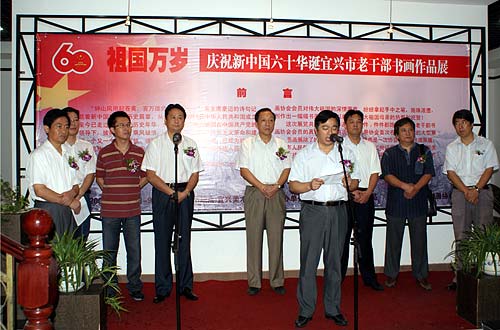 2009年9月15日,“庆祝新中国60华诞宜兴市老干部书画作品展”在市美术馆隆重开幕,60多位会员经过2个多月的精心创作,170多幅书画作品布满2个大展厅,表达了协会会员对新中国60华诞的祝贺。图为市委副书记邵亚群在开幕式上致辞。(图中左起:市老干部局局长吴和君、市老干部局副局长蒋宝军、市书协主席张六弢、市文联主席徐风、老干部书画协会会长高正昌、市委副书记邵亚群、市文广新局副局长魏敏、市美协主席吴俊达、市美协副主席刘明) |
