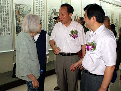 邵亚群副书记、高正昌会长与协会88岁高龄的黄家菊老人在展厅亲切交谈。 |