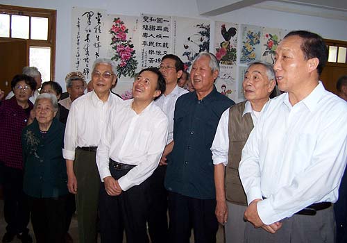 2009年10月23日,为隆重热烈欢度第22个敬老节,协会专门组织了一期“宜兴市老干部书画协会耄耋书画展”,协会共有29位耄耋老人参加了当天活动。图为耄耋老人们与市委组织部副部长诸永军(右4)、高正昌会长(右1)一起观看展览。 |