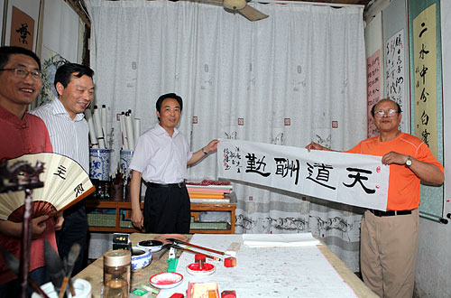 老干部书画协会会员储杰积极参与了我市申报国家历史文化名城的工作。6月27日,无锡市委常委、宜兴市委书记蒋洪亮在宜城月城街检查“申名”工作时,看望了“润东轩”书画室室主储杰,储杰当即书写“天道酬勤”书法作品赠予蒋书记。 |