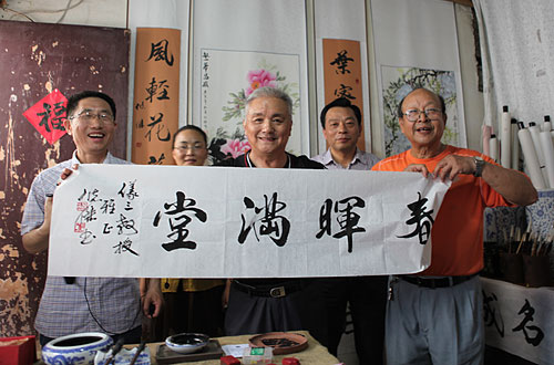 6月30日,国家历史文化名城考察组来到宜城月城街,“润东轩”书画室室主储杰(右1)当场书写“春晖满堂”作品,赠予考察组专家阮仪三教授(右3)收藏。 |