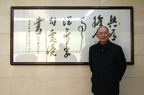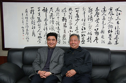 李伯春(右)行书作品。图为与孙小伟院长合影 |