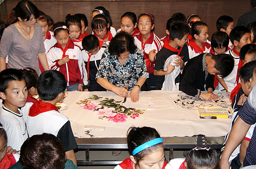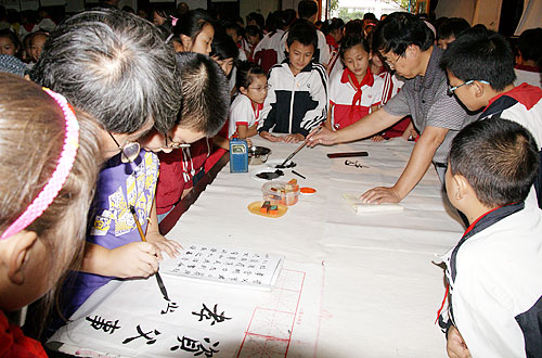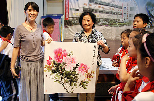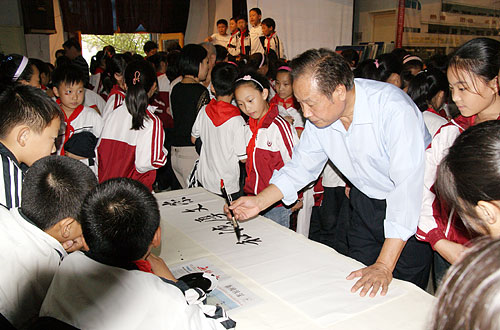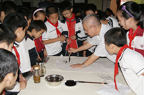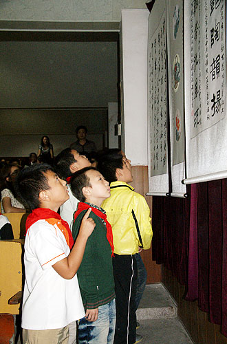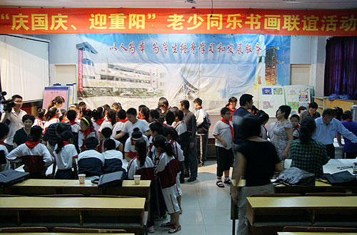9月29日下午,我协会与市陶城小学举行“庆国庆、迎重阳”老少同乐书画联谊活动。活动现场展出协会老干部创作的40多幅歌颂祖国62年伟大成就、讴歌党90年光辉历程为主题的书画作品,学校组织全校近千名学生参观了展览。而后老干部们与学校小书画家同台创作,老干部们将创作的30多幅作品全部赠给学校师生。整个活动气氛热烈,孩子们表现了浓厚的兴趣。