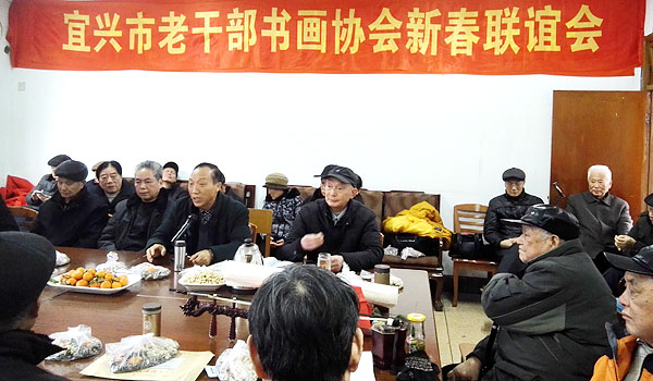 2月8日下午,窗外雨雪交加,室内暖意浓浓,我会在协会会议室举办2017年新春联谊会。许多老同志冒着风雪严寒,专程赶来参加联谊会。87岁高龄的葛天声、周倩华、任蕴等离休老干部来了,家住丁山的几位老同志也克服困难准时到会。协会的凝聚力很强,50多名会员济济一堂。高正昌会长首先致辞,向大家拜年,祝福大家身体健康、阖家幸福,並勉励大家在新的一年里书画创作再出新成果。联谊会由协会理事黄敏主持,在《没有共产党就没有新中国》的大合唱中开始。 |
