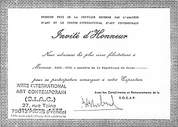 评审70位来自十数国家之艺术作品王农获第一名奖状