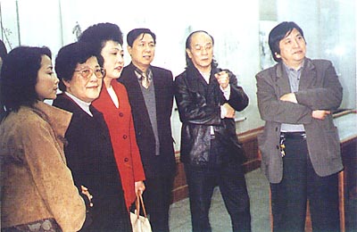 在尹瘦石逝世5周年之际,4月14日,已故宜兴籍画家尹瘦石夫人吕秀芳女士(右5),在中国美术馆赵俊生(右2)、市文化局局长周良君(右3)、市书画院院长吴俊达(右1)的陪同下,前来宜兴尹瘦石艺术馆祭扫、参观。