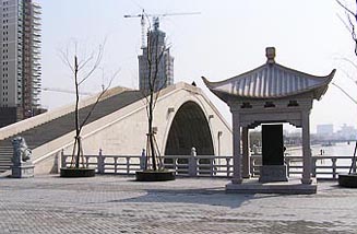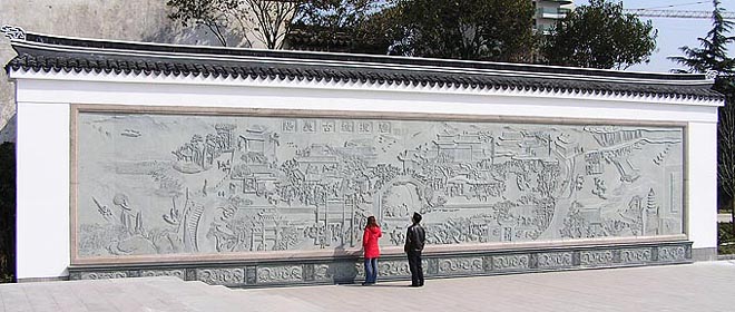 宜兴日报丁焕新2006年2月25日报道: 2月23日下午,无锡电视台记者来到宜兴采风,拍摄石刻壁画《阳羡古城揽胜》。 被誉为宜兴“清明上河图”的《阳羡古城揽胜》大型石刻浮雕壁画,于2月中旬在西氿之滨、重建的蛟桥之畔落成,长17米、高3米,全部用青石雕刻,展示了明代晚期宜兴的繁华景象和民俗风情,浓缩了古蛟桥、周王庙、徐溥国柱太师牌坊等30多个主要建筑或胜迹,再现了制造茶壶、运输陶缸、看大戏等生产、生活场景。画面中的400多位人物形神并茂、呼之欲出,堪称“宜兴第一壁画”。该作品由我市建设局文史小组创意,市美术家协会副主席邵家声绘画,清华大学美术学院研究生毕业的李正负责制作,与去年重建的蛟桥交相辉映,成为西氿风光带展示地方历史文化的又一景观。连日来,许多市民到氿滨欣赏这一作品,一些外地媒体也前来采访。