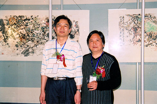 吴俊达(右)与著名美术理论家陈传席教授合影。背景为吴俊达作品 |
