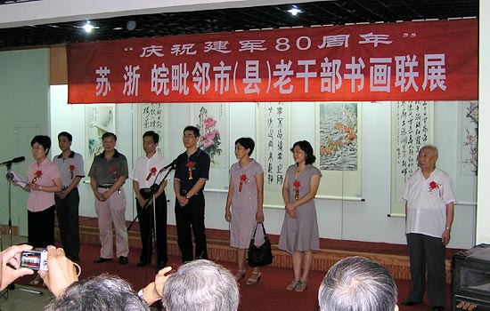 由宜兴市委老干部局发起组织的“庆祝建军80周年”苏、浙、皖毗邻市(县)老干部书画联展昨日在宜兴美术馆、宜兴徐悲鸿纪念馆开幕。市领导李江、洪雅,市老干部局及有关部门领导,来自江阴市、长兴县、广德县的老干部局领导及老干部代表,宜兴市老干部书画协会及宜兴书画界人士共同参加了这一盛会。副市长洪雅主持开幕式。 |