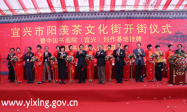 宜兴日报2008年10月29日报道:昨天上午,集文化、旅游、购物、休闲于一体的特色商业步行街———宜兴阳羡茶文化街正式开街。在开街仪式上,还同时举行了中国书画院(宜兴)创作基地挂牌和全国书画名人作品联展开展仪式。 |