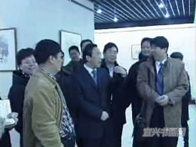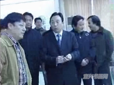 1月29日上午,无锡市委常委、宜兴市委书记蒋洪亮,市委常委、宣传部部长许伟英等专程来到宜兴美术馆参观“宜兴市国画院迎春画展”。(宜兴电视台荧幕截图) |