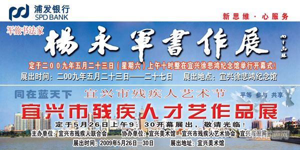 展 讯军 旅 书 法 家 杨永军书作展定于2009年5月23日(星期六)上午10时在宜兴徐悲鸿纪念馆举行开幕式,敬请光临! 展出时间:2009年5月23日—27日 展出地点:宜兴徐悲鸿纪念馆 —————————————————————————————— |