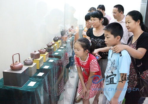 陶艺捐赠作品展亮相美术馆宜兴日报2009年7月27日报道:7月26日,为期五天的市陶瓷艺人捐赠作品展在市美术馆开幕。这些作品由市陶瓷实训基地组织198位陶瓷艺人集中捐赠,每位陶瓷艺人捐赠一件自己近年创作的代表作,在展示自己才艺的同时,也丰富了市美术馆的馆藏。图为市民欣赏捐赠作品。 (丁焕新 摄)