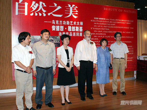 左起:无锡市美协主席梁元、无锡绿波美术馆馆长尤耀民、宜兴市副市长洪雅、安德烈·雅郎斯基与夫人、宜兴日报总编程伟。 |