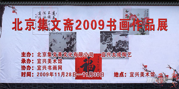 “北京集文斋2009书画作品展”于11月28日至30日在宜兴美术馆展出。北京集文斋是一家从事书画收藏交流、展售艺术精品、推介艺术名家的专业公司。此次来宜兴展出了启功、汤文选、焦可群、郑洪流、苏适等28位名家书画,以及特邀书画家魏楚予、王玉玺、刘敏作品。这些作者大多为中国美术家协会会员或中国书法家协会理事。 |