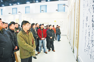 宜兴日报2010年1月18日报道:1月16日,由宜兴市委宣传部、吴江市委宣传部、宜兴日报社、吴江日报社共同主办的“拥抱太湖”吴江·宜兴书法艺术交流展,在吴江市图书馆隆重开幕。 宜兴和吴江是拥抱太湖、隔水相望的两座千年古城。宜兴有源远流长的“梁祝故事”,有融传统文化与现代文明为一体的“紫砂文化”,有着众多的名胜古迹和享誉世界的洞天、竹海、茶洲,并素有“教授之乡”、“书画之乡”的美誉。吴江作为太湖古文明的发祥地之一,有着著名的“江村文化”和“南社文化”,是全国四大绸都之一。在此次书法艺术交流展上,两地的60位书法家以太湖水为媒、以近百幅书法作品为载体,展示了两地各具特色的文化底蕴。图为两地书法家和书法爱好者们正在观看展览。(马超 文/摄)
