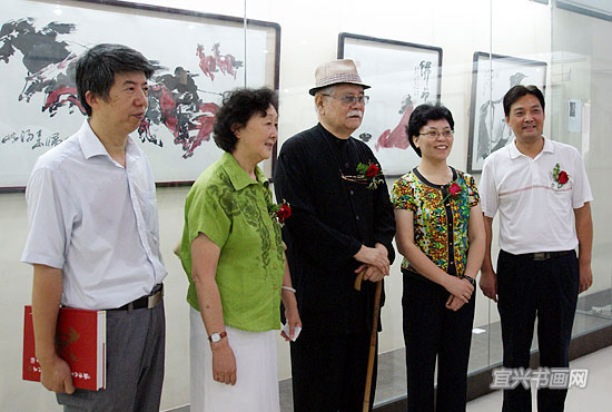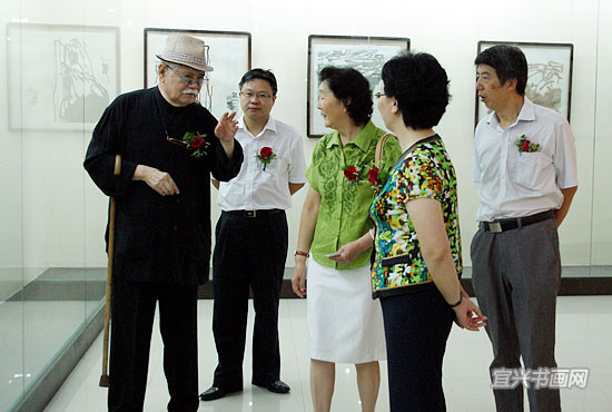 市领导许伟英、洪雅与台湾著名画家李奇茂(左3)、宜兴籍著名女画家朱理存(左2)参观画展 |