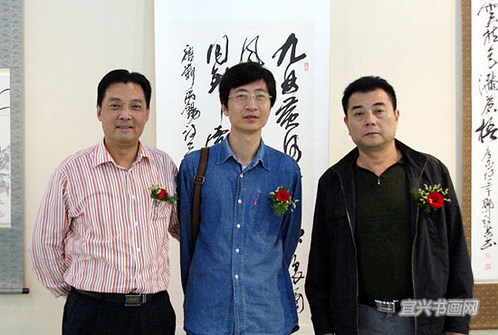 郭超英与宜兴市文广新局副局长魏敏(左)、杭州古豪书画有限公司总经理陈源冰(右)在展会上合影 |