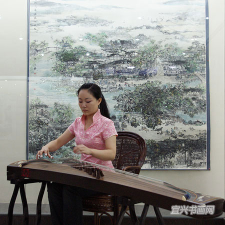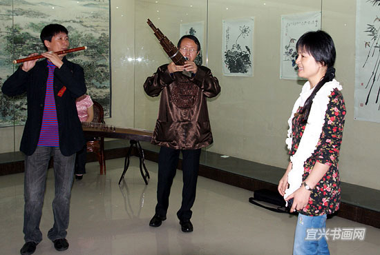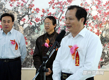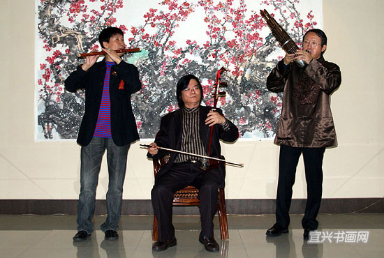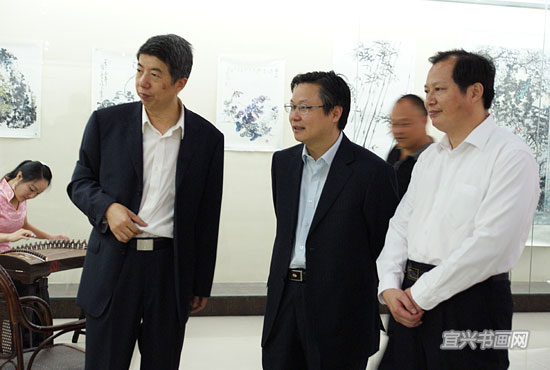 市政协协理员钮颂坚、无锡江南笛文化研究院院长杨强、无锡虎皇漆业有限公司董事长胡胜初、宜兴籍在京画家毛羽南出席画展开幕式。 |