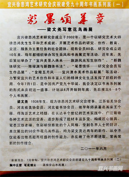 展 讯宜兴市徐悲鸿艺术研究会庆祝建党90周年书画系列展(一) 彩墨颂华章——梁文尧写意花鸟画展主办单位:宜兴市文物管理委员会 宜兴市徐悲鸿艺术研究会 展出时间:2011年6月25日起 展出地点:宜兴太平天国王府 ——————————————————————————————