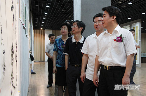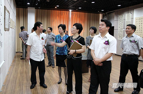 市书协主席张六弢向董平等领导介绍展览作品 |
