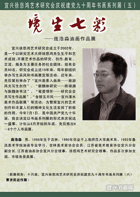 展 讯宜兴市徐悲鸿艺术研究会庆祝建党90周年书画系列展(五) 境生七彩——庞浩淼油画作品展主办单位:宜兴市文物管理委员会 宜兴市徐悲鸿艺术研究会 展出时间:2011年10月1日起 展出地点:宜兴太平天国王府 ——————————————————————————————
