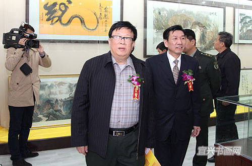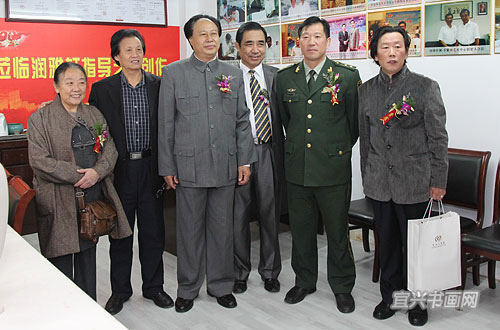 中国人民解放军沈阳军区原司令员钱国梁上将、中国党建画院院长张文祥、联合国文化总署常务副主席林运南、毛泽东主席特型演员古云等来宾参加宜兴市润雅轩书画院开业庆典合影 |