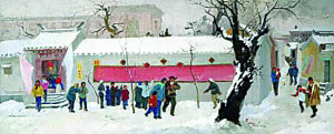 吴冠中的《迎接普选》创作于1961年,正临第四届人大代表选举之际。画家描绘了在古老的居民小区中人们争相走向投票站投票的热闹场景。吴冠中很少有世俗的生活题材作品,此画时代气息浓厚,反映了建国初期人们渴望当家做主、欣欣向荣的精神面貌。画家1956年开始任教于北京艺术学院,此画右下角有“1961 北京艺术学院”的签名。