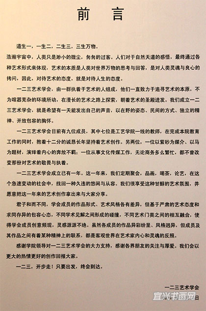 一个名为“三生万物”的艺术作品展,12月18日在无锡工艺职业技术学院开展。李津、卢剑星、王兴华、吴也宁、向峰、薛立祥、杨青峰、张鹏、董亚平九位参展作者,七位是学院的一线青年教师,多为学院从各地引进的优秀人才,他们毕业于高等艺术院校,都在各自领域有着优异成绩。九位艺术家的艺术领域各有不同,但进取和追求的理念将他们结合在一起,他们组成艺术团体“一二三艺术学会”,意为“一生二,二生三,三生万物”,体现了他们的抱负雄心。 |