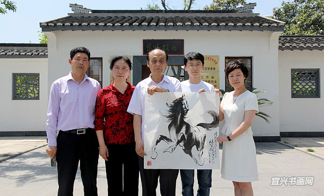 朱沛然水墨奔马作品《腾飞》捐赠悲鸿故居,并故居前合影 |