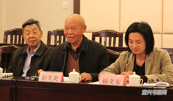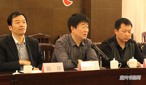 宜兴市文联副主席萧子君(中)、宜兴市书协主席庞现军(右)、宜兴市书协副主席陈伟(左) |