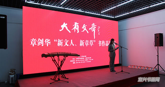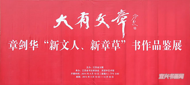 4月19日下午,吴冠中艺术馆展厅宾朋满座,气氛热烈,由江苏省文联主办,江苏省书法家协会、吴冠中艺术馆承办的“大有文章——章剑华‘新文人、新章草’书作品鉴展”在这里隆重举办。南京、无锡、宜兴等地众多书画界人士、各有关领导和老同志参加了开幕式。章剑华现为省委宣传部副部长、省文联党组书记、常务副主席,他长期担任领导职务,工作繁忙,但仍能抽出时间,在书法上不懈追求,并大有斩获。这次展出的92件书作,作品之精良,展览之气势,令人无不叹为观止。 |