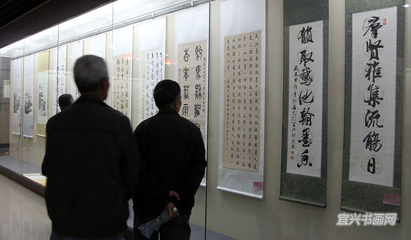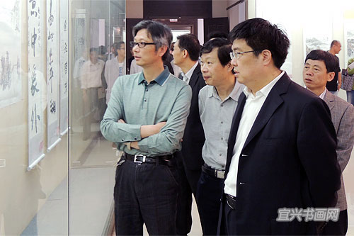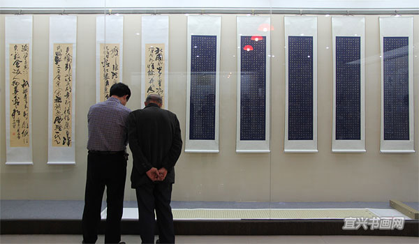 江苏省书法家协会副主席李啸、无锡市书法家协会主席王建源参观展览 (尹俊人/摄) |