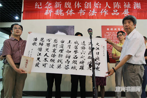 今年是新魏体创始人陈禄渊诞辰110周年,继今年1月《新魏体寻踪》一书出版,6月8日下午,由市文广新局、市文联、宜兴日报社联合主办的“纪念新魏体创始人陈禄渊新魏体书法作品展”在市美术馆开幕。上海市书法家协会秘书长潘善助,宜兴市委常委、宣传部长沈晓红出席活动。 |