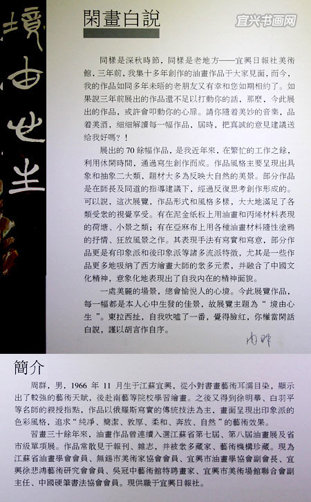 展 讯境由心生——周群油画作品展举办单位:宜兴日报社