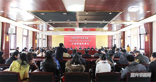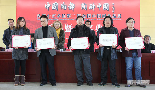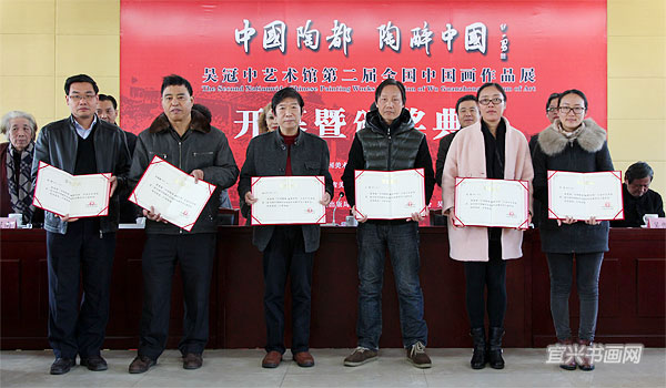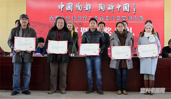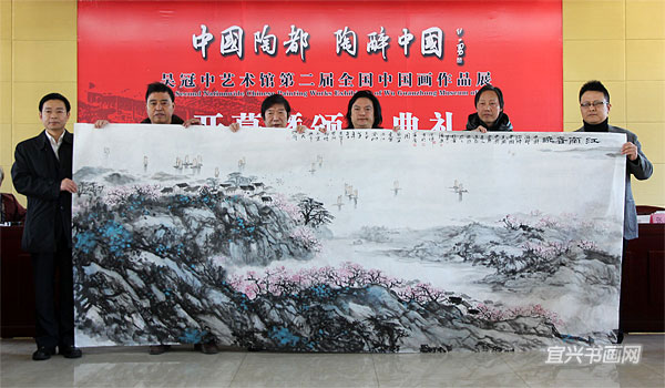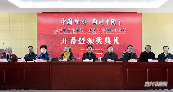 12月5日,“中国陶都·陶醉中国”吴冠中艺术馆第二届全国中国画作品展在我市隆重举行。展览由中国美术家协会、宜兴市人民政府主办,江苏省美术家协会、宜兴市委宣传部承办,宜兴市文广新局、宜兴市文联、吴冠中艺术馆协办。中国美协副秘书长杜军,江苏省美协副主席胡宁娜,我市领导周中平、沈晓红出席展览开幕暨颁奖典礼。 |