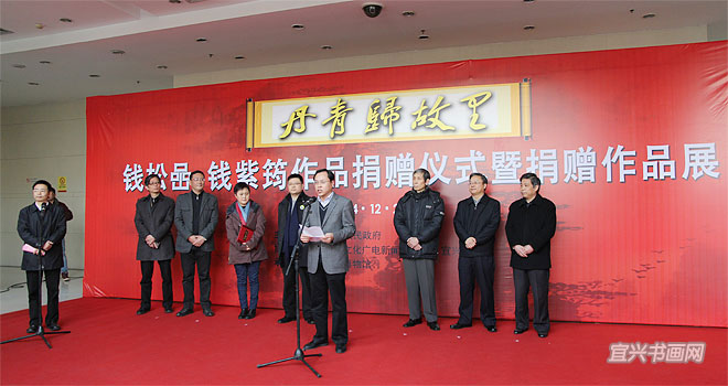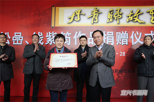 12月28日,由市人民政府主办,市文广新局、宜兴日报社协办,市博物馆承办的“丹青归故里——钱松嵒、钱紫筠作品捐赠仪式暨捐赠作品展”,在宜兴日报书画院隆重举行。钱松嵒外孙女、钱紫筠的女儿钱春涛,向市博物馆无偿捐赠钱松嵒作品4幅、钱紫筠作品40幅。副市长尹志华向钱春涛颁发捐赠证书,赞扬钱松嵒一家三代的家乡情怀和钱春涛为我市博物馆建设作出的重大贡献。 |