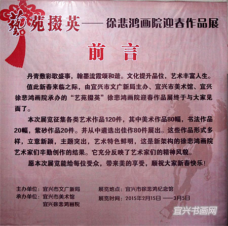 新春来临之际,“艺苑掇英——宜兴徐悲鸿书画院迎春作品展”2月15日起在宜兴徐悲鸿纪念馆展出。这是重组变更后的宜兴徐悲鸿书画院首次推出的展览。展览征集国画和油画作品80件、书法作品20件、紫砂陶艺作品20件,从中选出80件展出。展出作品种类丰富,特色鲜明,观赏性强。参展作者有:国画作者蒋焕余、王云芝、史晴峰、秦伟、蒋峰、刘建超、张莳钰、蒋宜平、王轩、高巍、刘明、马为民、蔡其亮、徐如昇、梅南屏、白云兰、周志群、蒋苏荣、戴良芬,油画作者钱卫中、颜星、周群、蒋祖澄、子子,书法作者周建明、徐肇基、谢才星、程伟、丁山明、陈洪亮、姚夏雨,紫砂陶艺作者周铁军、吴吉、卢宁刚、吴震、顾学中、骆耀明、陆轶舟、周益娟、沈小平、施昌、沈菊芳、徐浩俊、范国歆、谢丽君、姚志源、鲍雯君、蒋雨辰、许跃萍、周建明、崔燕、王仕平。 |