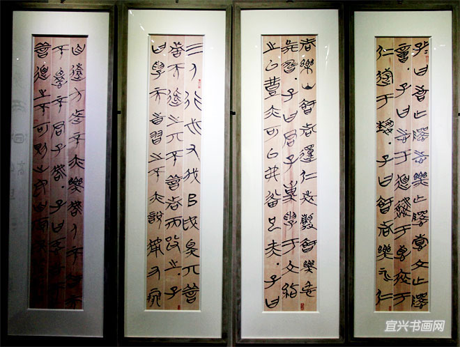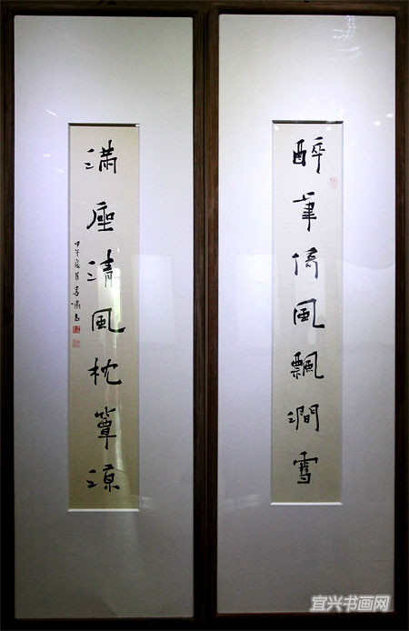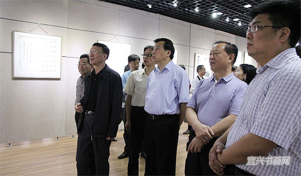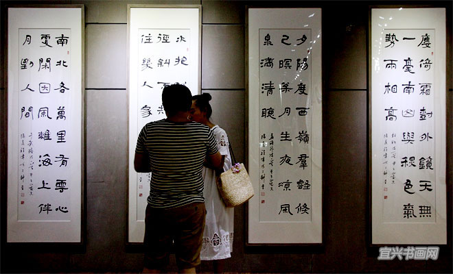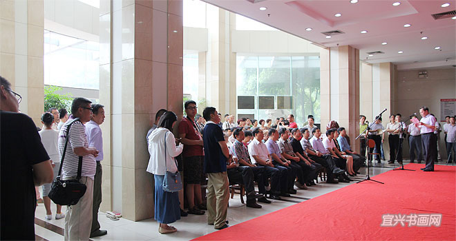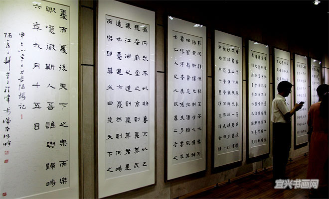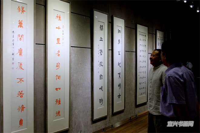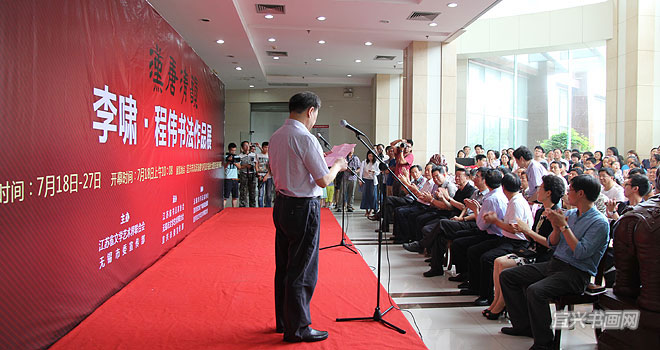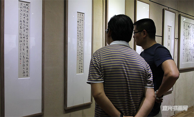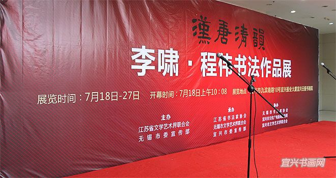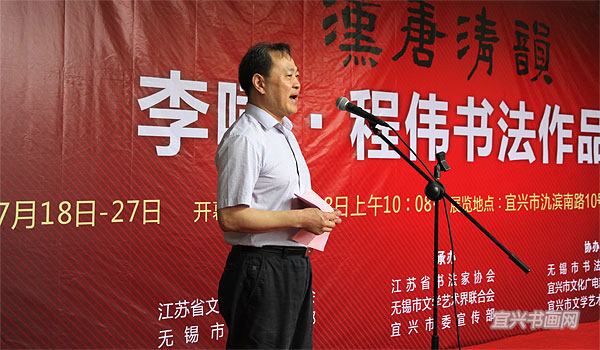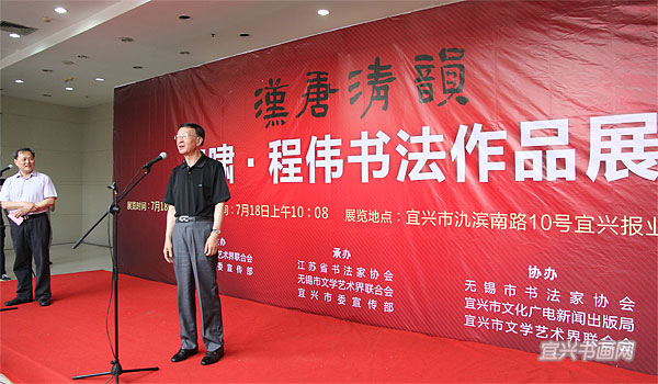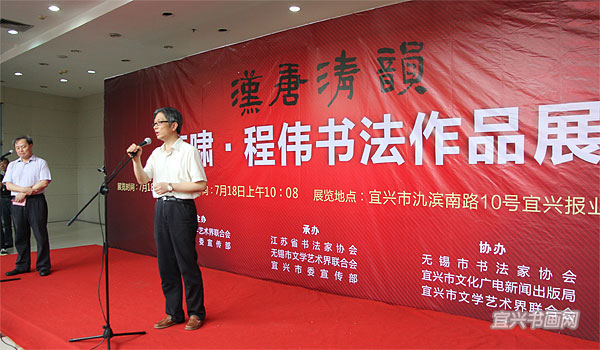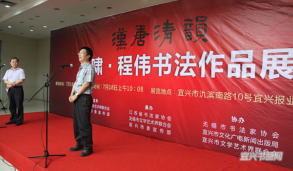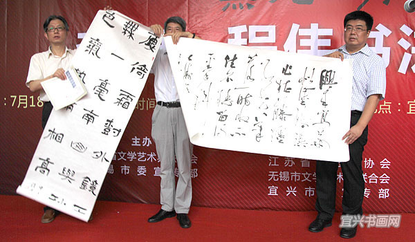 由江苏省文联、无锡市委宣传部主办,江苏省书法家协会、无锡市文联、宜兴市委宣传部承办的“汉唐清韵·李啸、程伟书法作品展”,7月18日上午在宜兴日报书画院开幕。展览共展出李啸、程伟书法作品80件。开幕式上两位书法家向宜兴市政府捐赠作品各一幅,由市美术馆收藏。 |