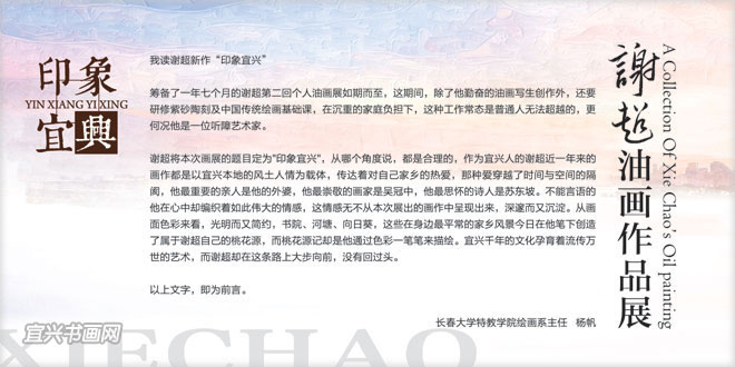 我读谢超新作“印象宜兴” 筹备了一年七个月的谢超第二回个人油画展如期而至,这期间,除了他勤奋的油画写生创作外,还要研修紫砂陶刻及中国传统绘画基础课,在沉重的家庭负担下,这种工作常态是普通人无法超越的,更何况他是一位听障艺术家。 —————————————————————————————— |